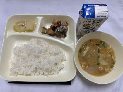 「さけのつけ焼き、とうがんの煮物、みそ汁、ごはん、牛乳」です。