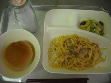 今日の給食は、「さけのクリームスパゲッティ、ビーンズサラダ、黒糖パン、牛乳」です。さけのクリームスパゲッティに使われているホワイトルウは、給食室で手作りしています。
