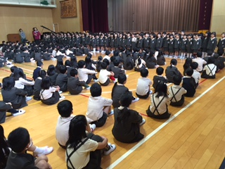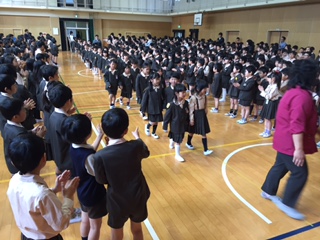 児童朝会後に、新1年生との対面式を行いました。本年度の1年生は126名です。まず1年生から「よろしくお願いします」の挨拶があり、2〜6年生もそれに答えて「よろしくお願いします」の挨拶をしました。これで、1年生も全校児童の仲間入りです。