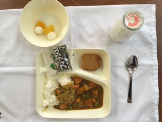 メニューは、カツカレーライス・フルーツ白玉・ミニフィッシュ・牛乳です。7人の調理員さんが、心をこめて作ってくださいました。ご家庭でも、はじめての小学校給食を食べたお子様の感想を、ぜひ聞いてあげてください!