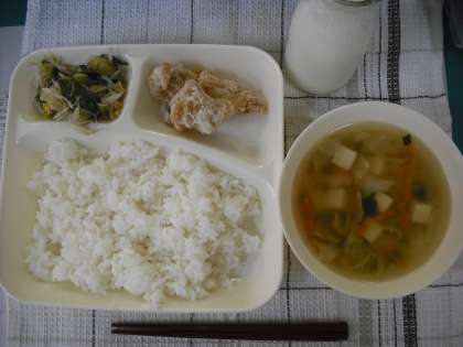今日の給食は、「鶏肉のからあげ、中華スープ、チンゲンサイともやしの甘酢あえ、ごはん、牛乳」でした。児童から「からあげおいしかった!!」という声をたくさん聞きました。