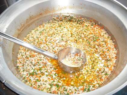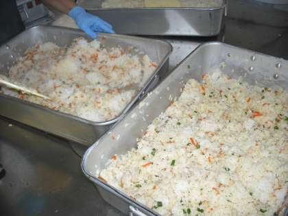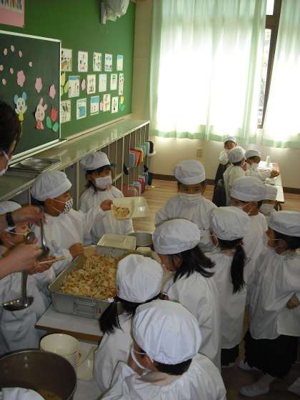 今日の給食は、「かやくご飯、みそ汁、焼きじゃが、牛乳」でした。児童に人気があったかやくご飯は、給食室でご飯と具を混ぜてつくります。