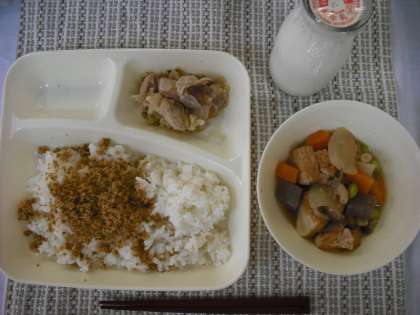 今日の給食は、「焼きとり、豚肉とあつあげの煮もの、紅さけそぼろ、ごはん、牛乳」でした。給食の焼きとりは、串にさしていません。鶏肉(もも)、白ねぎにしょうが汁で下味をつけて焼き物機(大型オーブン)で焼き、甘辛いしょうゆ味のタレにあわせています。児童に人気のある献立です。