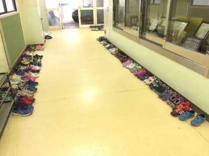 4年生が体育館で運動会演技の練習をしていました。体育館入口前の廊下には、きちんと並べられたくつがありました。