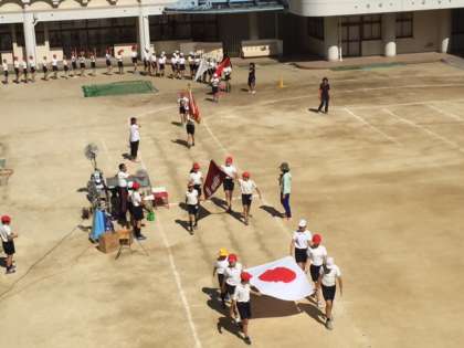 国旗を先頭にプラカード持っての入場行進の練習、開会式での宣誓、優勝旗準優勝盾の返還や授与、得点発表などです。
