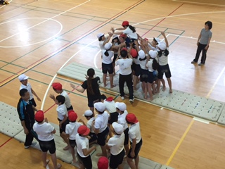 6年生がトラストフォールという技に挑戦しています。支える人と支えられる人の信頼関係が大切です。
