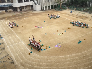 6年の団体演技が完成に近づいています。声をかけ合いタイミングを合わせていろいろな技を完成させていきます。