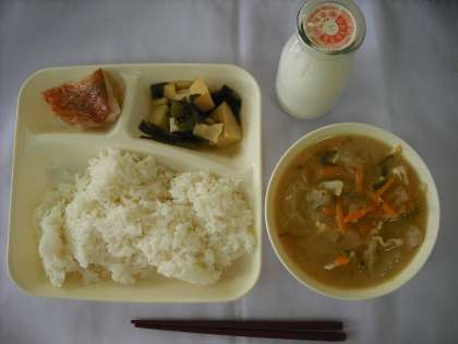 今日の給食は、「赤魚のしょうゆだれかけ、みそ汁、わかたけ煮、ごはん、牛乳」でした。彩りよい春らしい献立でした。みそ汁のみそは、赤みそと白みその両方を使っています。右の写真が今日のみそです。約9.5キログラムあります。