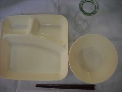 今日は、食器の置き方のおはなしをします。給食では、ごはん・パンなどの主食を左側におかずなどの主菜を右側におき、牛乳は食べる時に手が当たらないような奥におくように指導しています。