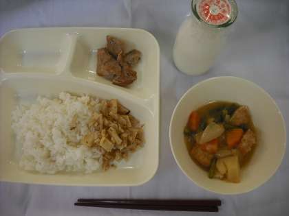 今日の給食は、「鶏肉のさんしょう焼き、じゃがいもとあつあげの煮物もの、ごまかかいため、ごはん、牛乳」でした。