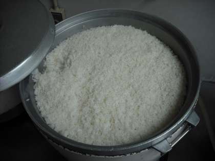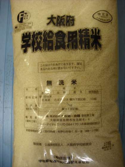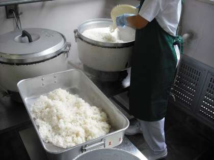 堀川小学校は、自校炊飯校といって給食室でごはんを炊いています。使われているお米の銘柄は、大阪市統一で「おぼろづき(北海道産)無洗米」です。