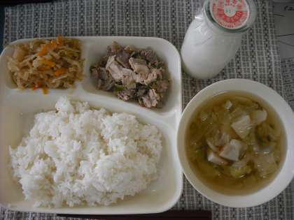 今日の給食は、「豚肉の梅風味焼き、すまし汁、切り干しだいこんのいため煮、ごはん、牛乳」でした。給食では、切り干しだいこんのいため煮のように乾物を使った献立がよく登場します。児童にも好評でよく食べています。一番左の写真が、切り干し大根をもどしている様子です。