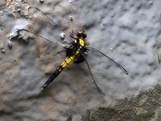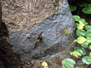 休み時間に七夕池を観察していると、トンボがかえったところだったのでしょうか、羽を休めてとまっていました。