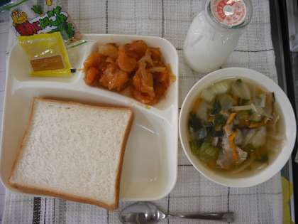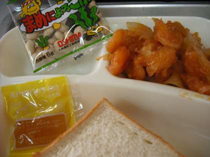 今日の給食は、「えびのチリソース、中華スープ、豆こんぶ(製品)、食パン、まめこんぶ、牛乳」でした。えびのチリソースは、トウバンジャンを隠し味に使っています。