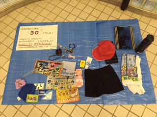 玄関ホールに落とし物が置かれています。今月は、30個です。