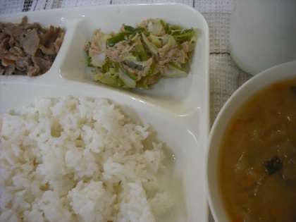 今日の給食は、「豚肉のおろしじょうゆかけ、みそ汁、野菜いため、ごはん、牛乳」でした。おろししょうゆかけは、大根おろしとゆず(果汁)を使いさっぱりとした味の焼き物献立です。野菜いためは、ツナと野菜を一緒にいためて野菜が苦手な児童でも食べやすくしています。