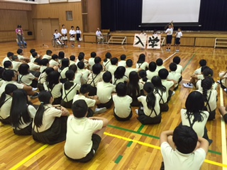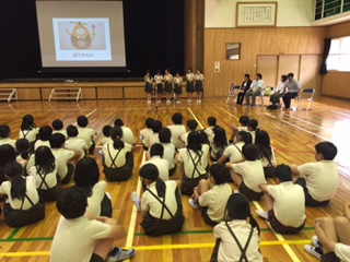 体育館で交流会を行いました。お互いの小学校の紹介し合い、心温まるおもてなしをしていただきました。