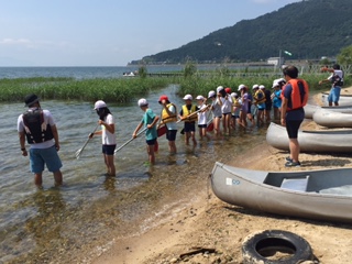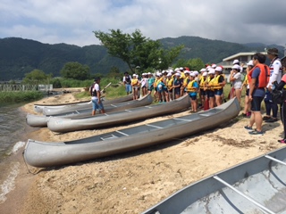カヌー活動が始まりました。自分たちの乗るカヌーをみんなで運び、乗り方の説明を聞いたら、いよいよ開始です。