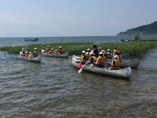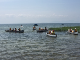 4人一組で沖のブイをめざして漕ぎます。慣れない始めは思わぬ方向へ行ってしまいます。