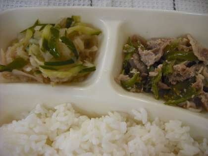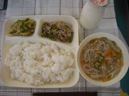 今日の給食は、「豚肉とピーマンのしょうが焼き、にゅうめん、切り干しだいこんの梅風味、ごはん、牛乳」でした。暑くなってくると牛乳の残食量がぐっと減ります。このまま残食0を続けてほしいです。