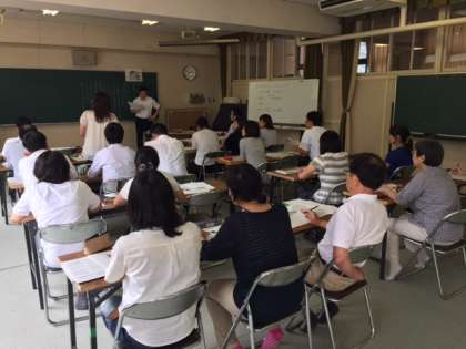 道徳の授業を実際に教職員が子どもになって受けて、授業の進め方を学びます。模擬授業の後は、葛藤資料を用いた「一読四分進法」などについて学びました。