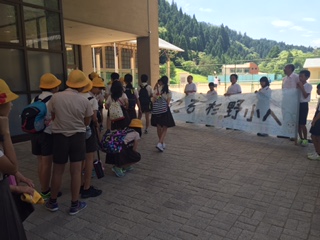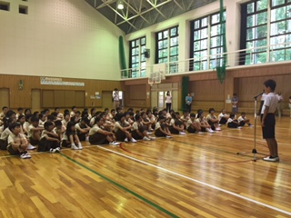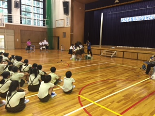 お互いの学校の代表の挨拶の後、交流会を行いました。杉野小学校からは学校紹介、堀川小学校からは歌のプレゼントをしました。