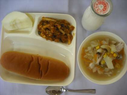 今日の給食は、「なすのミートグラタン、鶏肉と野菜のスープ、りんご(1/4)、黒糖パン、牛乳」でした。今日のパンは、黒糖パン(一人一個)でした。黒糖パンは、ほんのりとあまく、ふかふか柔らかいパンなので人気があります。また、りんごは、1年生から3年生は、皮をむいて芯をとって出しています。4年生(今日は、4年生は社会見学で給食はありません)から6年生は、芯だけをとって皮はそのまま食べるようにしています。低学年は、りんごの皮をむいていると残食量がぐっと少なくなります。