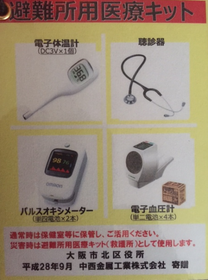 校区内にある中西金属工業様から、区内の避難所に指定されている小学校に避難所用医療キットを寄贈していただきました。