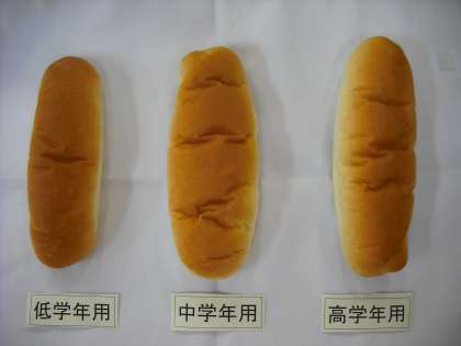 給食に登場するパンの種類は、食パン、大型コッペパン、レーズンパン、黒糖ロールパン、黒糖パン、ライ麦パン、パンプキンパンがあります。また、パンの大きさも低学年用(1・2年)、中学年用(3・4年)、高学年用(5・6年)の3段階あります。写真は、大型コッペッパンです。