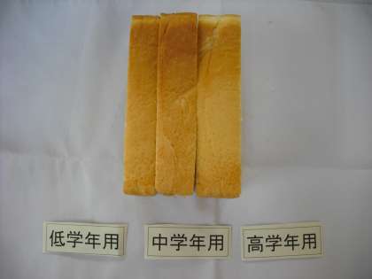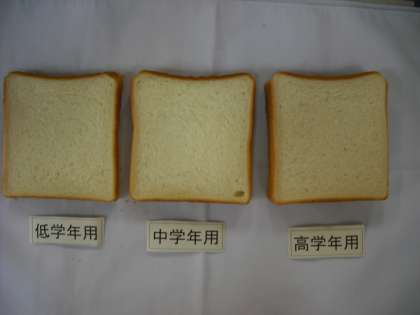 食パンでは、大きさは同じぐらいですが、厚さが違います。市販の食パンで比べると低学年(1・2年)が6枚切り、中学年(3・4年)が5枚切り、高学年(5・6年)が4枚切り程度の厚さがあります。