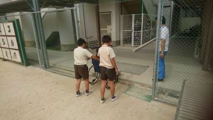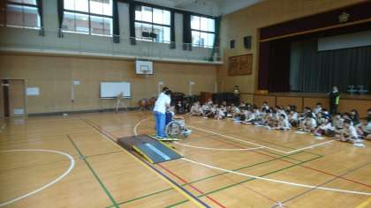 4年生が車いす体験の学習を行いました。最初に障がい者リハビリテーションセンターの方からお話を聞きました。その後、実際に車いすに乗って校内の段差などを体験します。みんな真剣に取り組んでいました。