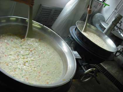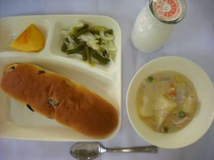 今日の給食は、「コーンクリームシチュー、キャベツと三度豆のサラダ、かき(ひらたねなしがき)、レーズンパン、牛乳」でした。コーンクリームシチューは、小麦アレルギーのある児童も食べることができるように上新粉(米の粉)でとろみをつけています。