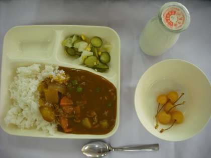 今日の給食は、「ポークカレーライス、野菜サラダ、さくらんぼ缶詰、牛乳」でした。今日のカレーに使われているカレールウは、小麦粉のかわりに米粉を使った米粉ルウです。アレルギーで小麦粉を食べることができない児童にも給食のカレーが食べられるように導入されました。