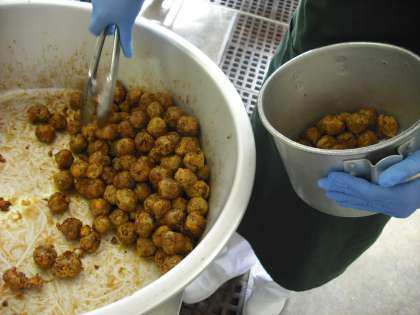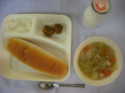 今日の給食は、「たこボール、スープ煮、だいこんのピクルス、レーズンパン、牛乳」でした。たこボールは、たこ焼きを意識した揚げ物献立です。給食室でソースをかけています。