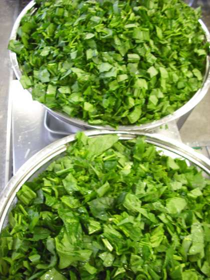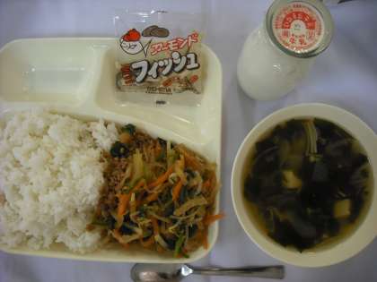 今日の給食は、「ビビンバ、わかめスープ、アーモンドフィッシュ、牛乳」でした。ビビンバは、児童に人気のある献立です。肉と野菜が別の食缶に入っています。教室で児童が肉と野菜を盛り付けます。また、わかめスープに使われてい豆腐は冷凍豆腐(写真左)を使っています。