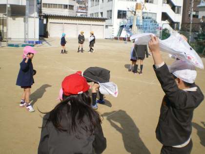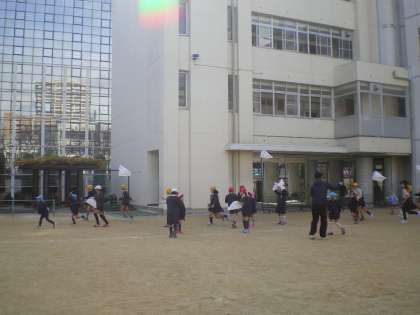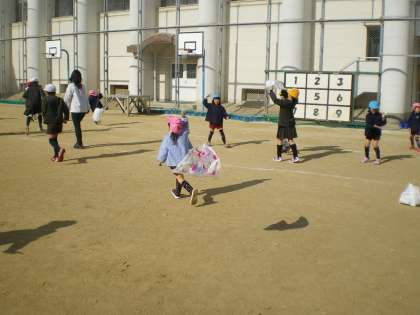 1月14日(火)の昼休み、本校運動場で4年生の児童と幼稚園のばら組(4歳児)とそら組(5歳児)の園児が合同でたこあげ大会を行いました。
