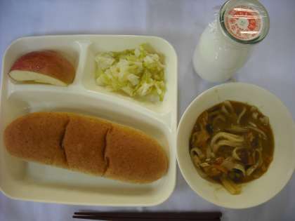 「カレーうどん、きゃべつの甘酢あえ、りんご、ライ麦パン、牛乳」