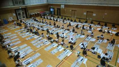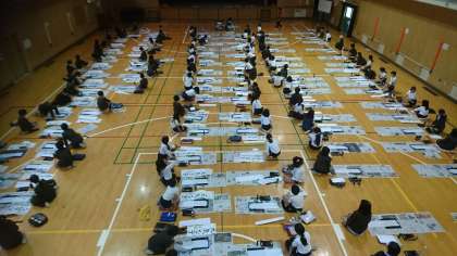 1時間目に4年生の書き初め大会が講堂で行われました。先生が書いている様子をプロジェクターでスクリーンに映して、お手本にします。子どもたちは真剣に半紙にむかい、丁寧に「元気な子」と書きあげていました。