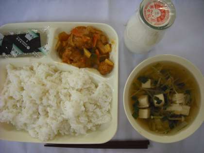今日の給食は、「酢豚、とうふのスープ、焼きのり、ごはん、牛乳」でした。酢豚は、酢とケチャップを使い甘酸っぱい味になっています。