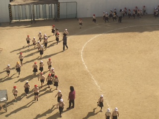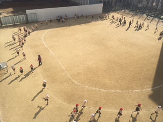 今日は、寒さも一休み、1年生の子どたちもかけ足を頑張っています。