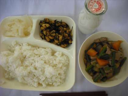 今日の給食は、根菜類や大豆を使ったかみごたえのある献立でした。「筑前煮、ひじき豆、だいこんのゆず風味、ごはん、牛乳」でした。ひじき豆は、児童に人気がある豆料理です。
