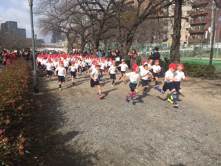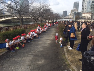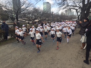 1年生の子どもたちにとっては初めての「堀川マラソン」です。大川沿いを1.5km走ります。