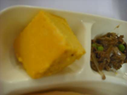 「牛肉のデミグラスソース煮、コーンスープ、かぼちゃのプリン、黒糖パン、牛乳」