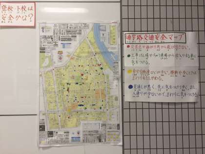 校区マップを玄関に掲示し、子どもたちと教職員で危険だと思う所に色シールを貼って「通学路交通安全マップ」を作りました。