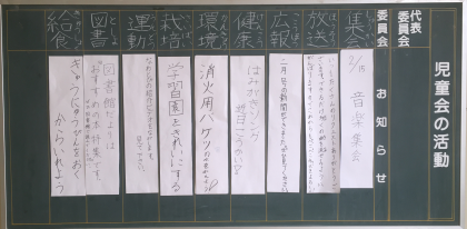 毎月児童委員会が開かれた後に、校内掲示板に各委員会からのお知らせが貼られています。