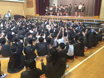 今日の児童集会は給食委員会の子どもたちによる「給食クイズ」でした。