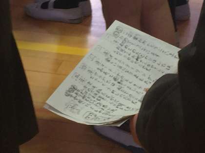 今日の集会は、1年生から5年生の子どもたちが集まって明日の「卒業を祝う会」(児童会主催)の練習をしました。