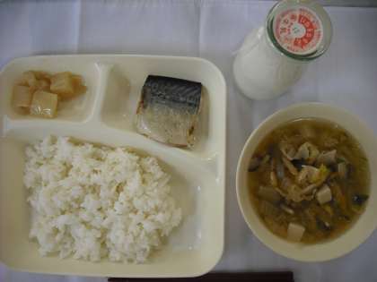 「さばの塩焼き、五目汁、だいこんのみそ煮、ごはん、牛乳」でした。さばは、日本の周りの海でもたくさんとれるので、よく食べられてきた魚です。給食では、塩焼きにしています。