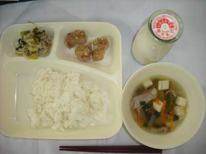 「鶏肉のからあげ、中華スープ、チンゲンサイともやしの甘酢あえ、ごはん、牛乳」