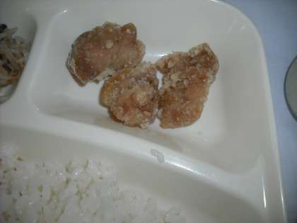 今日は、児童に大人気のから揚げでした。鶏肉にじゃがいもでんぷんをまぶして揚げています。サクッとした歯ごたえのからあげになっています。